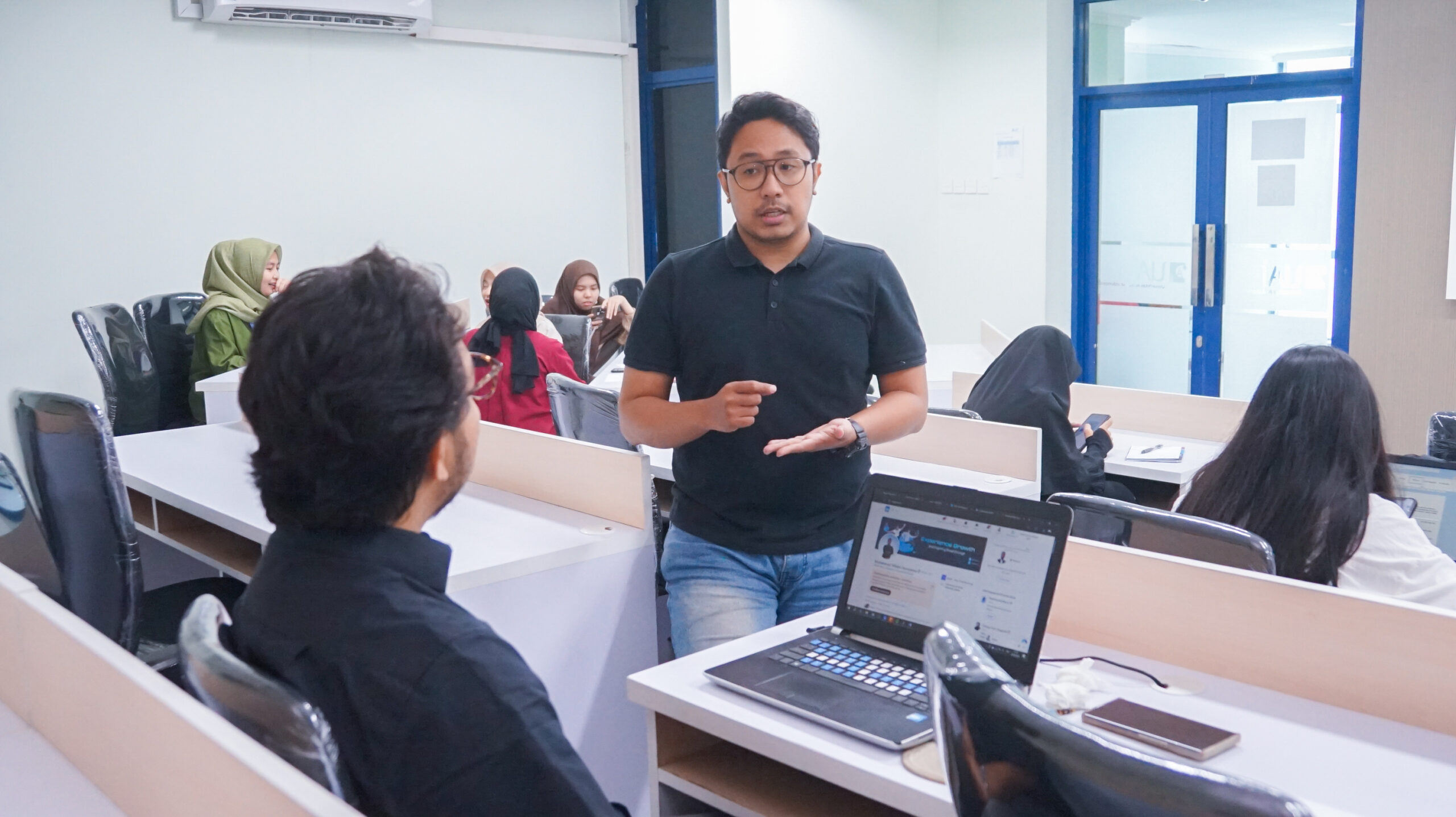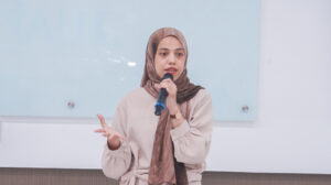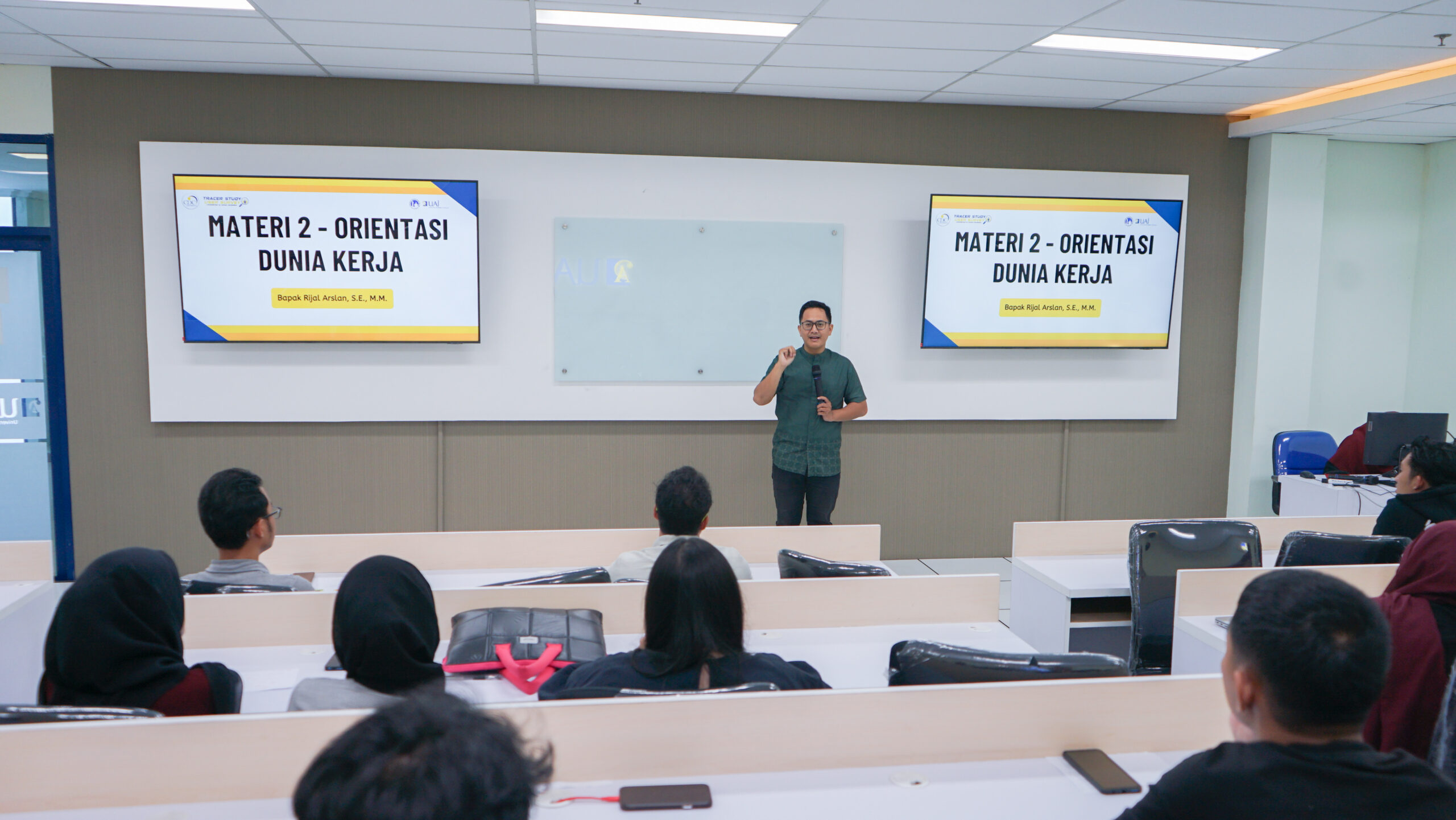 Setelah itu, Dosen Tetap UAI, Rijal Arslan, S.E., M.M., menyampaikan materi seputar orientasi dunia kerja. Ia membahas tren industri, perbedaan antara dunia kampus dan dunia kerja, serta harapan perusahaan terhadap calon karyawan. “Jadi karyawan itu harus memiliki jiwa entrepreneur,” ucapnya.