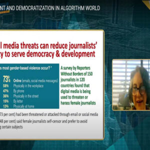 ‘’Sekitar 73 persen (jurnalis perempuan) diancam atau diserang melalui email atau media sosial, sekitar 48 persen jurnalis perempuan menyensor diri sendiri dan lebih memilih menghindari menyebutkan subjek tertentu,’’ papar Angela dalam acara yang dihadiri sekitar 480 peserta melalui zoom meeting dan siaran langsung youtube.