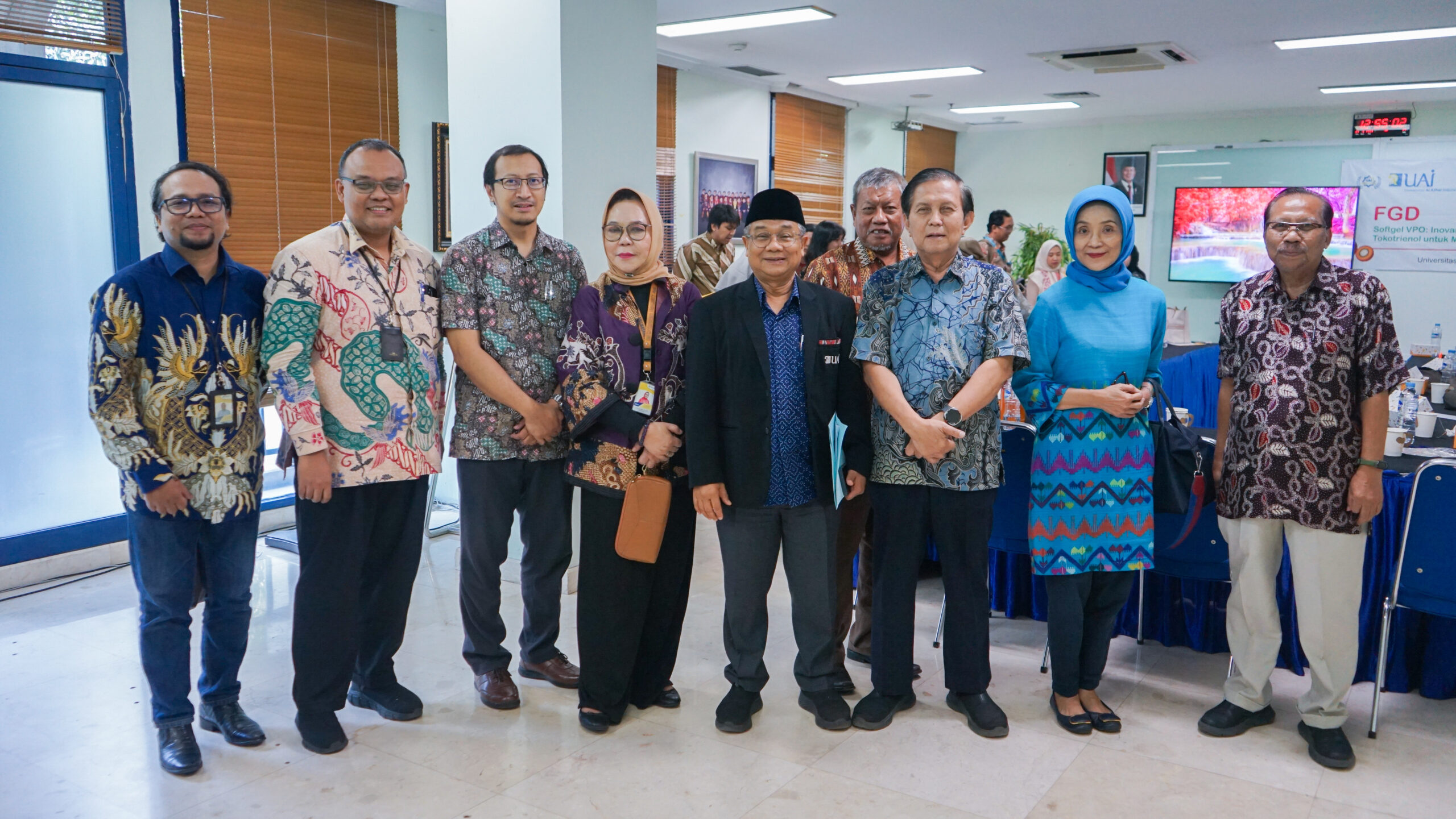 Perwakilan UAI yang hadir dalam FGD Softgel VPO antara lain Prof. Dr. Ir. Asep Saefuddin, M.Sc. (Rektor), Dr. Drs. Zirmansyah, M.Pd. (Wakil Rektor I Bidang Akademik), Ir. Ade Suryanti, M.M., IPU (Wakil Rektor II Bidang Sumber Daya), dan Dr. Faisal Hendra, Lc., M.A. (Wakil Rektor III Bidang Kemahasiswaan). Turut hadir pula Dr. Mohamad Ghozali Moenawar, Lc., M.M. (Kepala Kantor Kerja Sama Internasional & Kemitraan), Dr. rer. nat. Yunus Effendi, S.Pd., M.Si., M.Sc. (Kepala Lembaga Penelitian, Inovasi, dan Pemberdayaan Masyarakat), serta Dr. H. Widiyanto Dwi Surya, M.Sc. (Direktur Aliansi Strategis UAI), bersama para dosen Fakultas Sains dan Teknologi (FST).