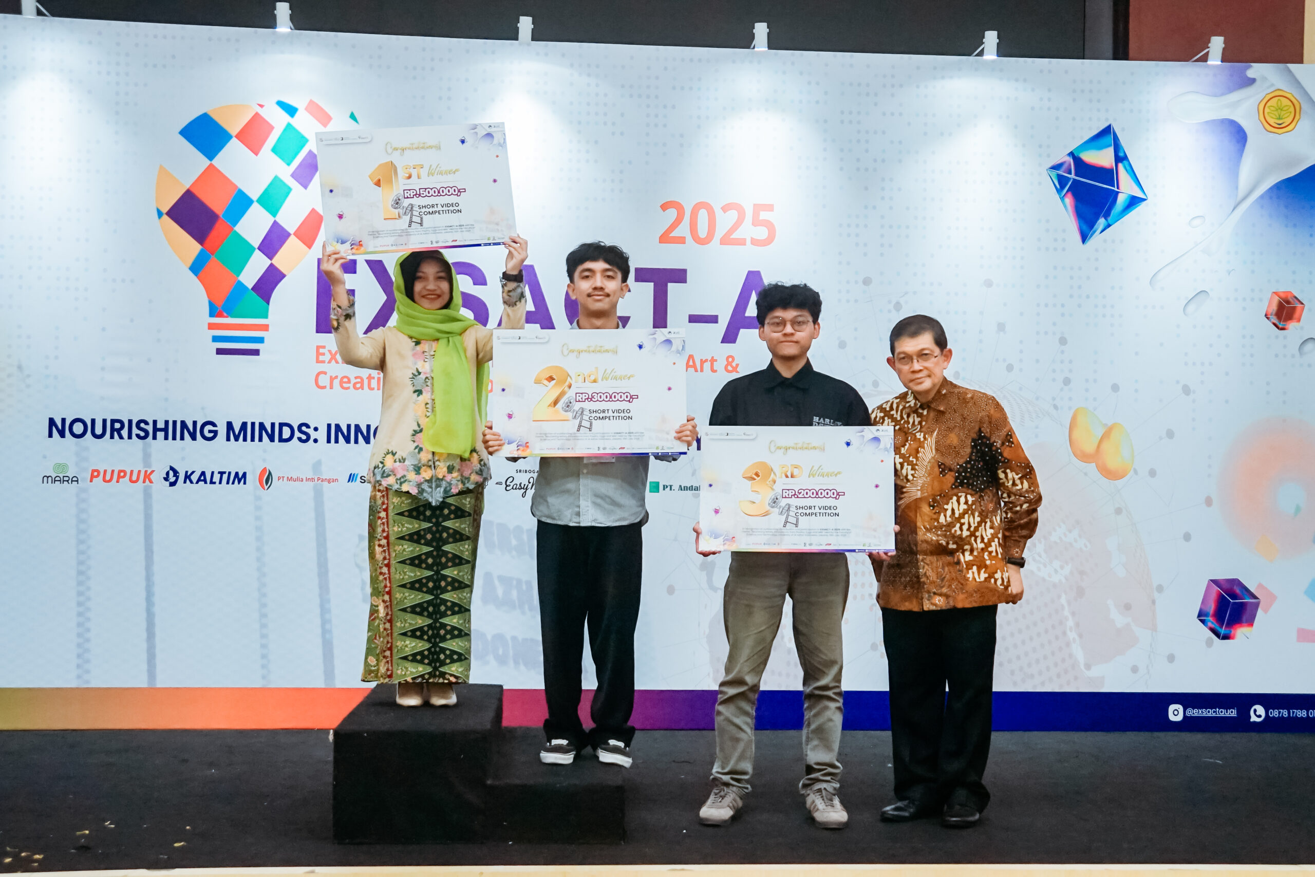 Selain seminar internasional, EXSACT-A 2025 menghadirkan beragam kompetisi seperti Short Video Competition, Photography Competition, Paper Presentation (Pararell Session), Lomba dan Pameran Produk Inovasi, serta pertunjukan seni budaya (Art & Culture Performance) yang diikuti oleh para mahasiswa. Berikut adalah para pemenang dari masing-masing kategori: