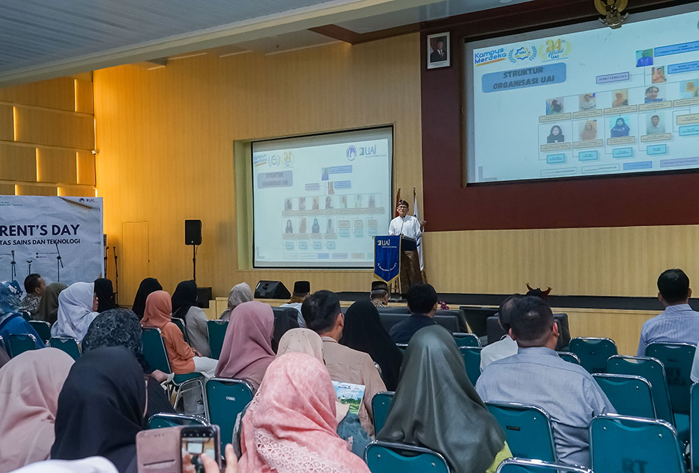 Acara dibuka oleh Dekan FST UAI, Ir. Hidayat Yorianta Sasaerila, M.Sc., Ph.D. Beliau menyampaikan bahwa Parent’s Day 2025 menjadi momentum strategis untuk memperkenalkan visi dan misi FST, termasuk akreditasi serta prestasi mahasiswa. Beliau juga menekankan pentingnya pengembangan kurikulum berbasis AI, Data Science, Internet of Things (IoT) yang dilandasi nilai-nilai kemanusiaan dan Islam. Harapannya, FST UAI menjadi rumah bagi generasi cerdas, bijak, dan bertanggung jawab dalam menggunakan teknologi.