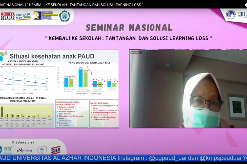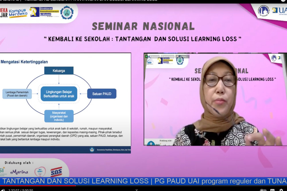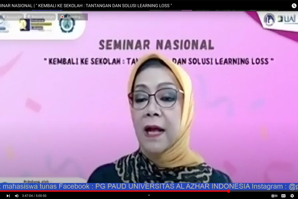 PG-PAUD Universitas Al Azhar Indonesia (UAI) sebagai program studi yang fokus utamanya adalah anak-anak usia dini beserta lingkungan pendukungnya, menyelenggarakan Seminar Nasional dengang mengangkat tema “Kembali Ke Sekolah: Tantangan dan Solusi Learning Loss” melalui daring pada hari Kamis (09/06).