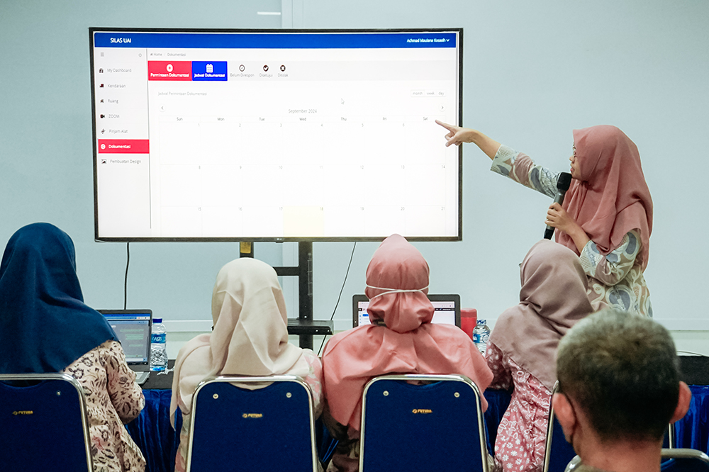 Selanjutnya, Dini Priatini, S.K.M., selaku Sekretariat Eksekutif UAI, memberikan penjelasan mengenai perubahan pada sistem SILAS. Beliau menjelaskan bahwa SILAS kini memiliki fitur tambahan seperti permintaan peminjaman alat, dokumentasi, dan pembuatan desain, yang sebelumnya hanya melayani peminjaman ruangan dan kendaraan. Beliau juga mengungkapkan bahwa ke depannya SILAS akan melayani kebutuhan persuratan, jadwal pimpinan, legalitas, hingga peminjaman tenda biru, selasar lobi utama, dan lobi ekstensi.