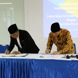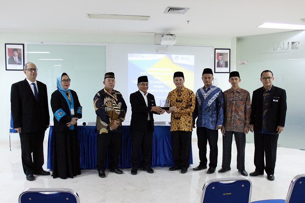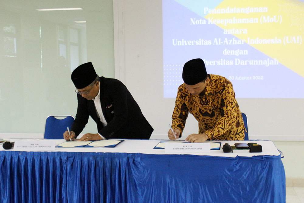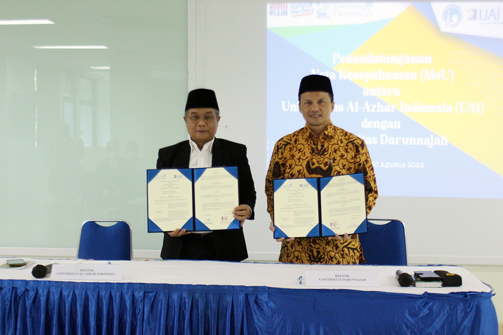 Universitas Al-Azhar Indonesia (UAI) melakukan penandatanganan Nota Kesepahaman (MoU) dengan Universitas Darunnajah (UDN) pada Selasa (30/08) di Ruang Serbaguna Lantai 2 UAI. Turut hadir pada kesempatan tersebut yaitu Rektor UAI (Prof Dr. Ir. Asep Saefuddin, M.Sc.) beserta jajaran Wakil Rektor UAI, Rektor Universitas Darunnajah (Ust. Dr. Much Hasan Darojat) beserta jajaran Wakil Rektor Universitas Darunnajah, dan undangan lainnya dari lingkungan UAI.