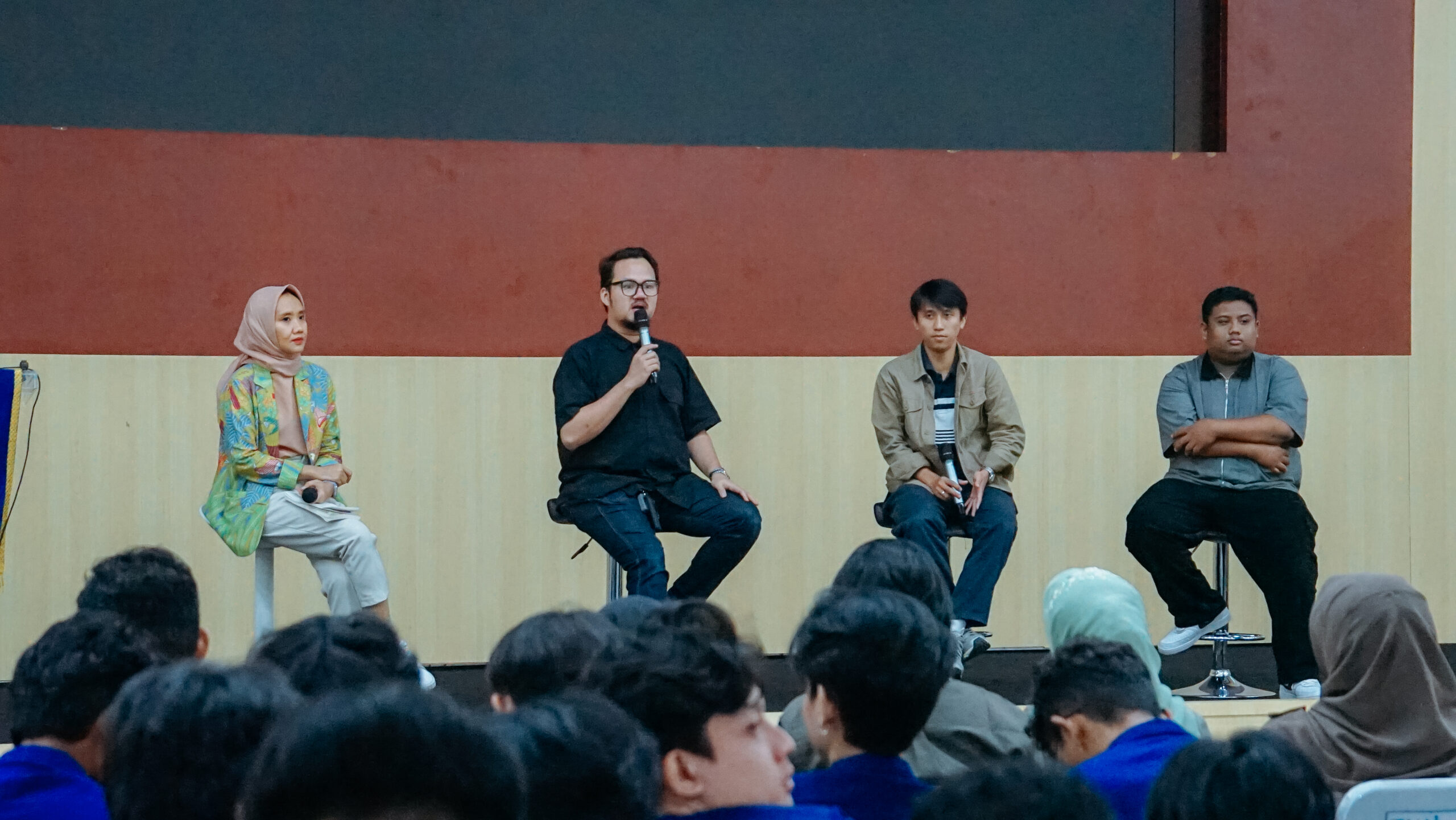 Kegiatan berlanjut dengan diskusi interaktif bersama tiga alumni Ilmu Komunikasi UAI yang dimoderatori oleh Sekretaris Prodi Ilmu Komunikasi UAI, Ruvira Arindita, S.I.Kom., M.Si. Pembicara pertama, Dimas Rahmatullah, Staf Studio Ilkom UAI, menyampaikan materi “Digital Adaptation in Mass Media.” Ia menjelaskan bahwa meski radio mulai jarang digunakan, karier broadcaster tetap memiliki masa depan. Menurutnya, kunci bertahan di industri ini adalah menjadi melek digital, pembelajar cepat, dan mampu berkomunikasi lintas platform.