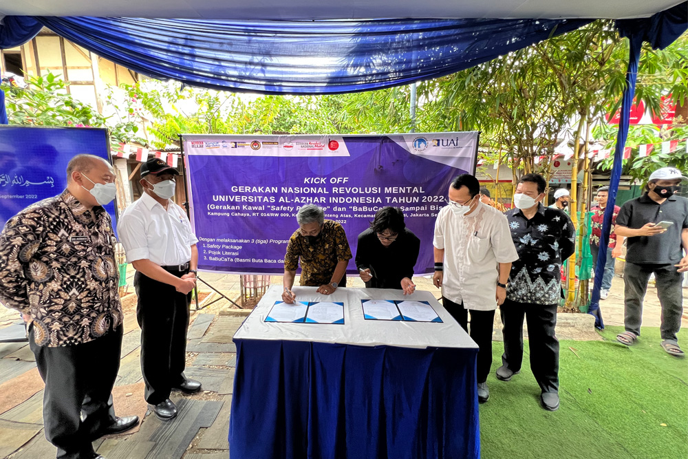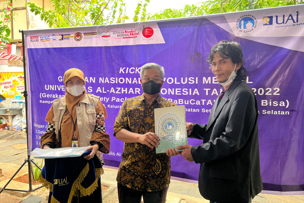 Secara simbolis dengan dukungan dari Rektor UAI, Menko PKM, kepada PIC GNRM UAI, Ibu Dr. Iin Suryaningsih, S.S., M.A dan mitra YOI school, Bapak Teguh untuk acara kegiatan GNRM UAI secara berkelanjutan, yaitu kegiatan BaBuCaTa (Baca Tulis Al Quran) sampai bisa, Pojok literasi dan safety package.