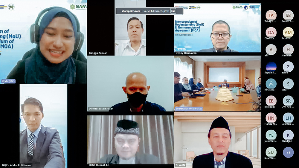 Universitas Al-Azhar Indonesia dan Nafa Qur’anic Center menyelenggarakan penandatanganan Memorandum of Understanding (MoU) dan Memorandum of Agreement (MoA) yang berlangsung secara online melalui MS.Teams pada Selasa, 12 November 2024. Acara ini dilaksanakan dalam rangka menghadapi tantangan kemajuan teknologi informasi yang sangat cepat dan upaya penguatan jati diri para mahasiswa agar memiliki karakter serta moral etika islami.