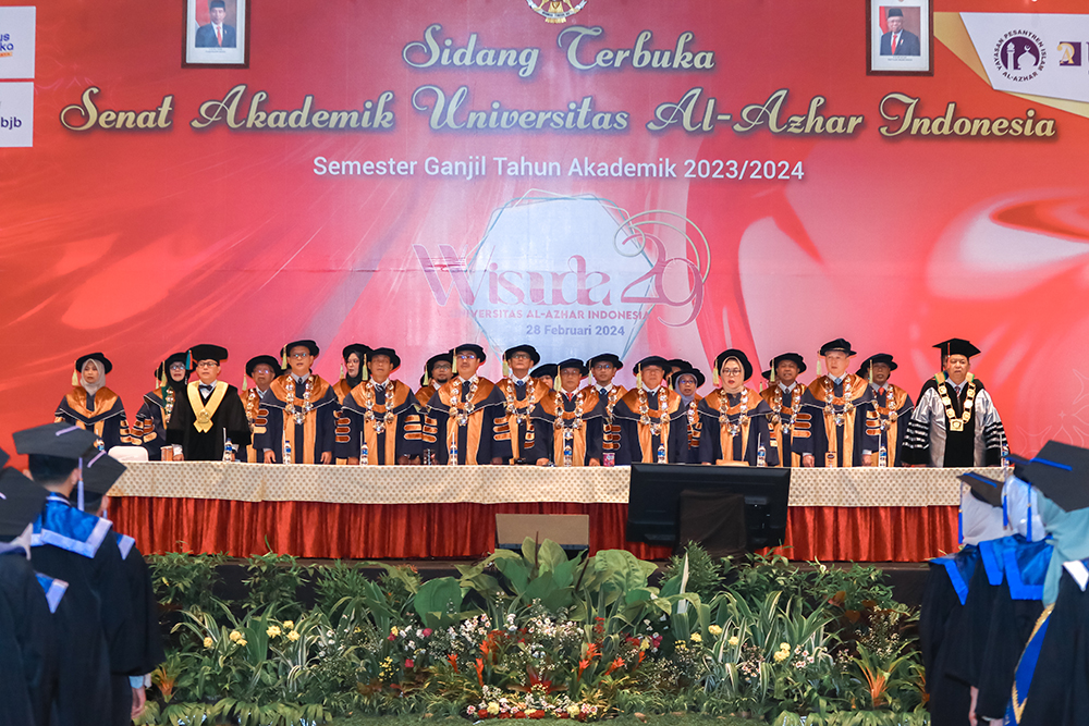 Jakarta, 28 Februari 2024, Universitas Al-Azhar Indonesia (UAI) sukses menyelenggarakan wisuda ke-29, Tahun Akademik (T.A) 2023-2024. Prosesi wisuda Universitas Al-Azhar Indonesia ke-29 berlangsung di Gedung Sasana Kriya Taman Mini Indonesia Indah, Jakarta Timur pada Rabu, 28 Februari 2024. Acara wisuda ini dilangsungkan sebanyak satu sesi dengan jumlah wisudawan sebanyak 708 orang dan dilantik oleh Rektor UAI, Prof. Dr. Ir. Asep Saefuddin, M.Sc. melalui sidang terbuka senat akademik Universitas Al-Azhar Indonesia. Wisuda UAI ke-29 dimulai pada pukul 07.00 hingga 11.00 WIB. Wisuda ini dihadiri oleh wisudawan yang berasal dari berbagai Fakultas di UAI, seperti Fakultas Ilmu Pengetahuan Budaya, fakultas Psikologi dan Pendidikan, Fakultas Ilmu Hukum, Fakultas Sains dan Teknologi, Fakultas Ekonomi dan Bisnis, serta Fakultas Ilmu Sosial dan Ilmu Politik.