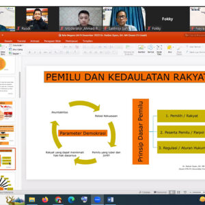 Dalam materi beliau yang berjudul “Peran mahasiswa mengawal pemilu pengawasan partisipatif pemilu serentak 2024” beliau mengajak peserta webinar untuk mengenal badan apa saja yang mengawal pemilu di Indonesia dalam rangka pemilu tahun 2024 nanti, dijelaskan bahwa untuk badan pengawas pemilu di Indonesia terdiri dari Komisi Pemilihan Umum(penyelenggara) , Badan Pengawas Pemilu( pengawas) , dan Dewan Kehormatan Penyelenggaraan Pemilu(menganangi pelanggaran kode etik) .