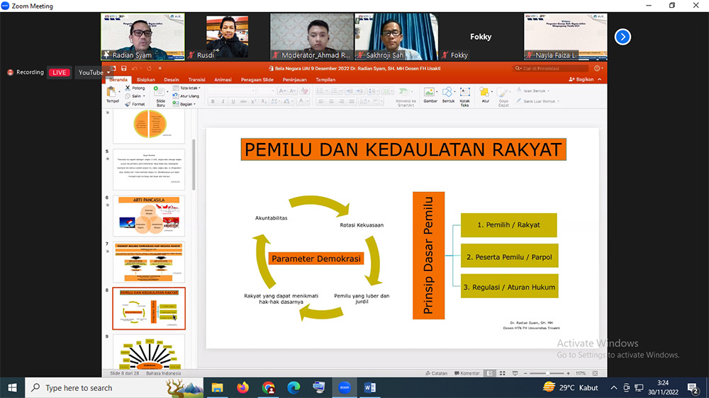Narasumber II, Dr. Radian Syam, SH., MH (Akademisi dam Alumni TOF /Training of Fasilitasor Bela Negara), dengan judul topik bahasan “Bela Negara dalam Pemilu 2024”