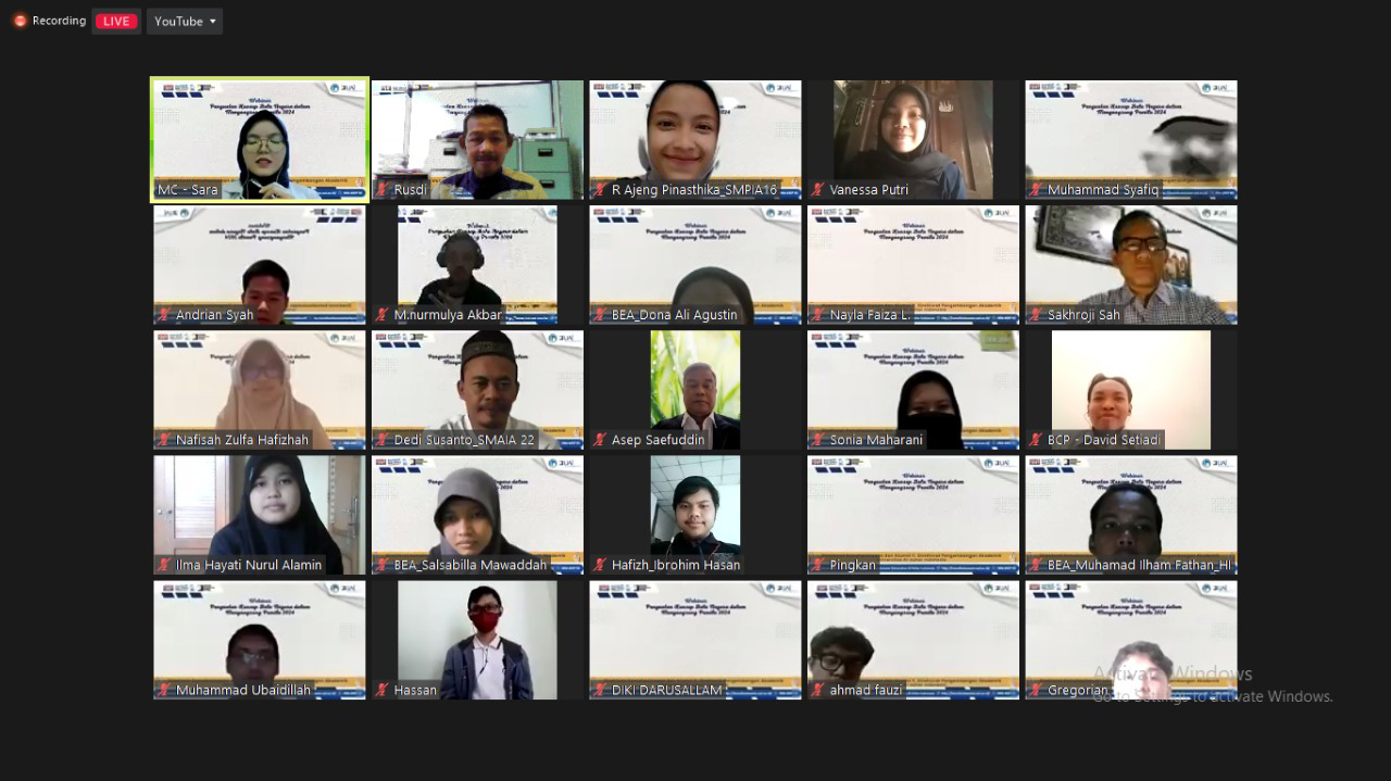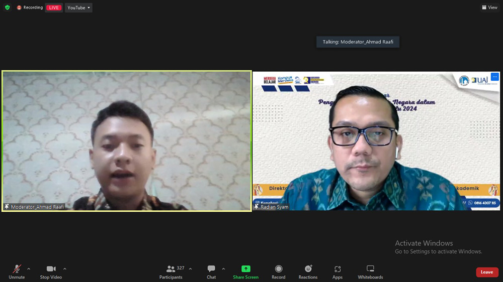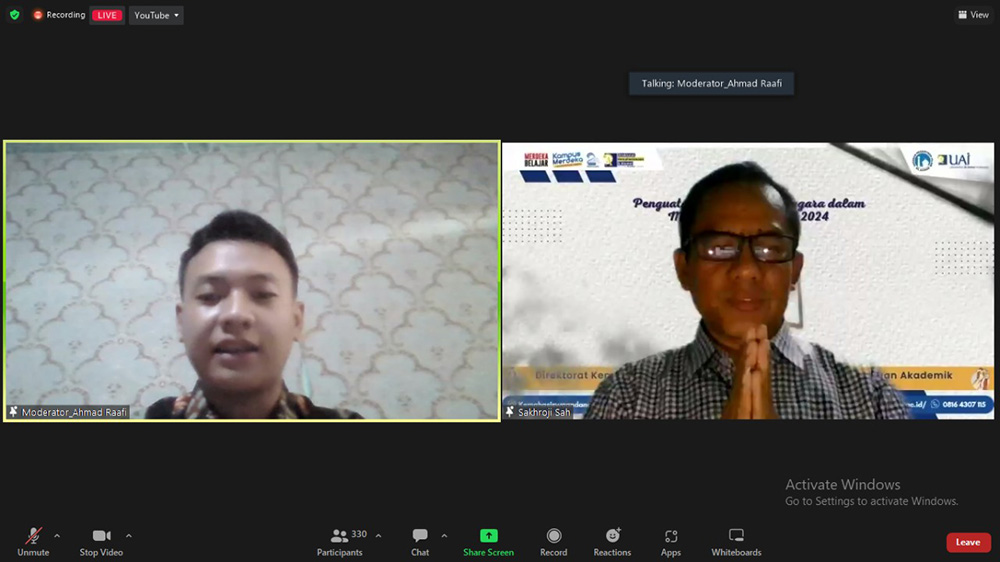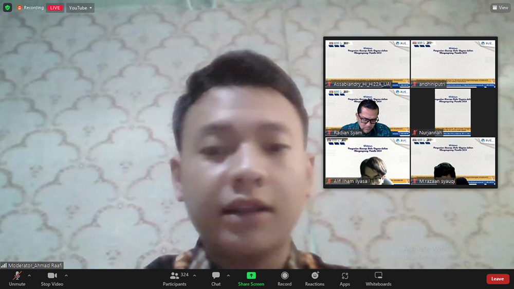 Acara Webinar ini dibuka dan diresmikan oleh Rektor Universitas Al Azhar Indonesia Prof. Dr. Ir. Asep Saefuddin, M.Sc., dan dalam sambutannya menyampaikan bahwa beliau sangat mendukung kegiatan webinar tentang bela negara, selain menghadirkan narasumber yang kompeten di bidangnya juga merupakan turunan dari rasa cinta tanah air di kalangan mahasiswa dan anak bangsa, beliau merasa diskusi mengenai bela negara ini sangat penting mengingat konsep tentang bela negara bukan hanya tentang mengangkat senjata dan perang saja melainkan lebih luas dari hal tersebut, misalkan pada partisipasi mahasiswa dalam rangka pemilu pada tahun 2024. Untuk itu beliau berharap pada acara webinar hari ini, seluruh mahasiswa dan peserta lainnya agar menyimak , bertanya, serta menyebarluaskan hasil dari diskusi acara webinar ini.
