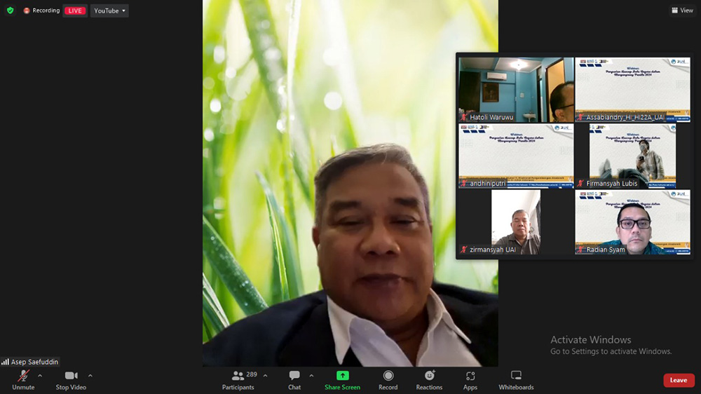 Narasumber I, Dr. Fokky Fuad, S.H., M.Hum. (Ketua Prodi Magister Hukum UAI), dengan judul topik bahasan “Bela Negara dalam perspektif Islam”