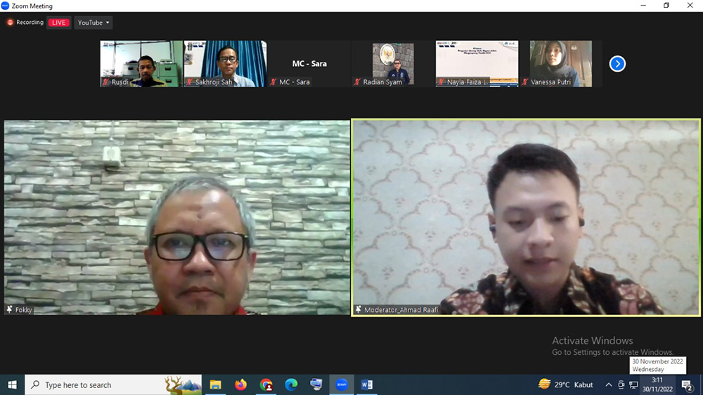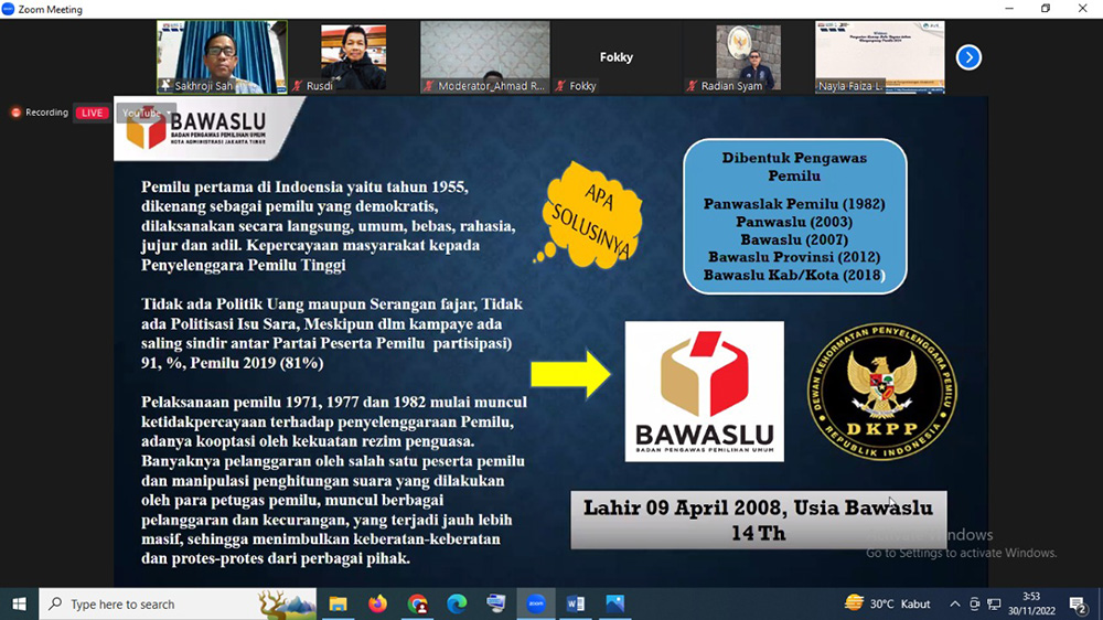 Dalam materi beliau yang berjudul “Peran mahasiswa mengawal pemilu pengawasan partisipatif pemilu serentak 2024” beliau mengajak peserta webinar untuk mengenal badan apa saja yang mengawal pemilu di Indonesia dalam rangka pemilu tahun 2024 nanti, dijelaskan bahwa untuk badan pengawas pemilu di Indonesia terdiri dari Komisi Pemilihan Umum(penyelenggara) , Badan Pengawas Pemilu( pengawas) , dan Dewan Kehormatan Penyelenggaraan Pemilu(menganangi pelanggaran kode etik) .